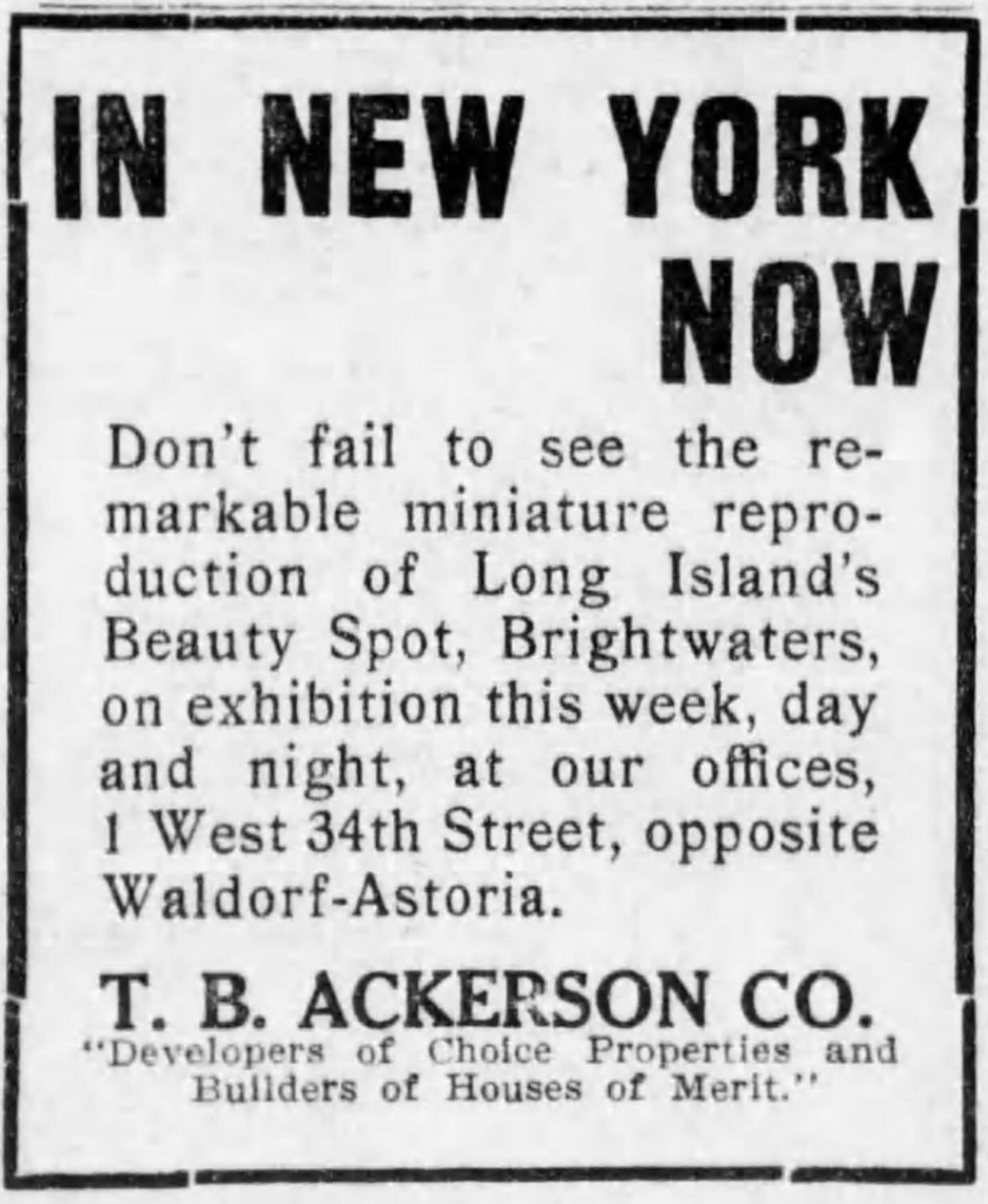 In 1910, The T.B. Ackerson Company moved its executive offices to West 34th Street, directly across from the original Waldorf-Astoria. It featured a full miniature reproduction of Brightwaters for prospective buyers, “covering 110 sq feet, showing the topography of the property, its environments, hundreds of pretty homes (architecturally reproduced in miniature, even to the color scheme).”