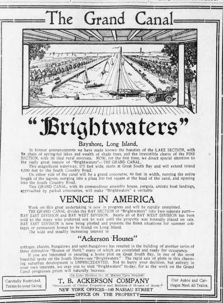 Flashback to 1908 with this fascinating glimpse from The Brooklyn Daily Eagle, highlighting the visionary development of Brightwaters’ Grand Canal, hailing as “Venice in America.” This historic advertisement from September 6, 1908, reveals T. B. Ackerson’s grand vision for Brightwaters, transforming the Lake Section and Pine Section into a haven of spring-fed lakes, shade trees, and the allure of a true maritime community. Ackerson’s Houses promised elegant living spaces, reflecting a careful blend of nature and craftsmanship, a legacy still admired today.